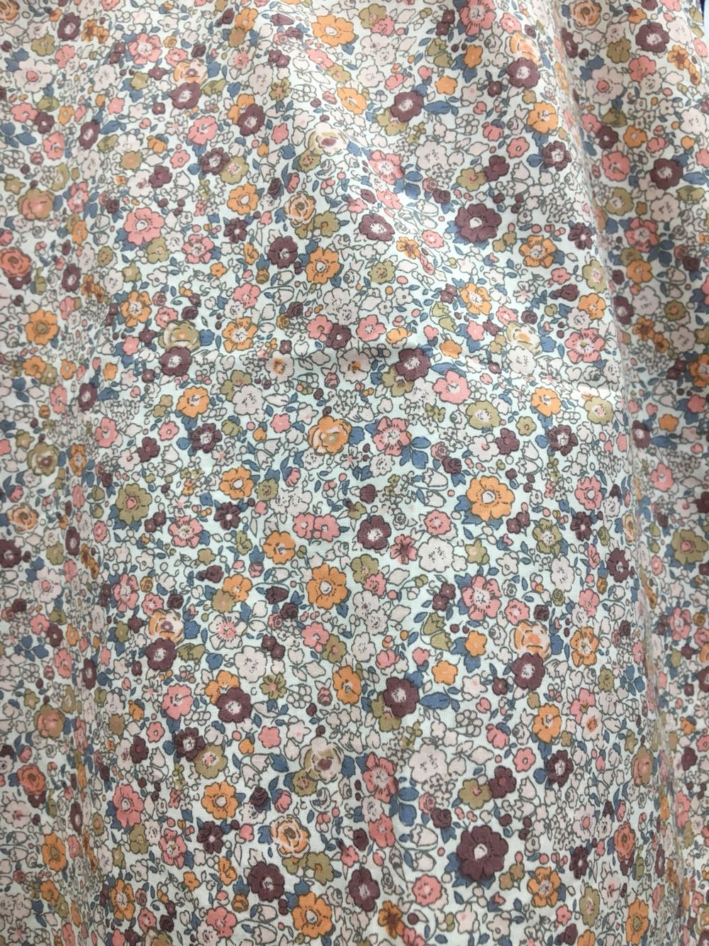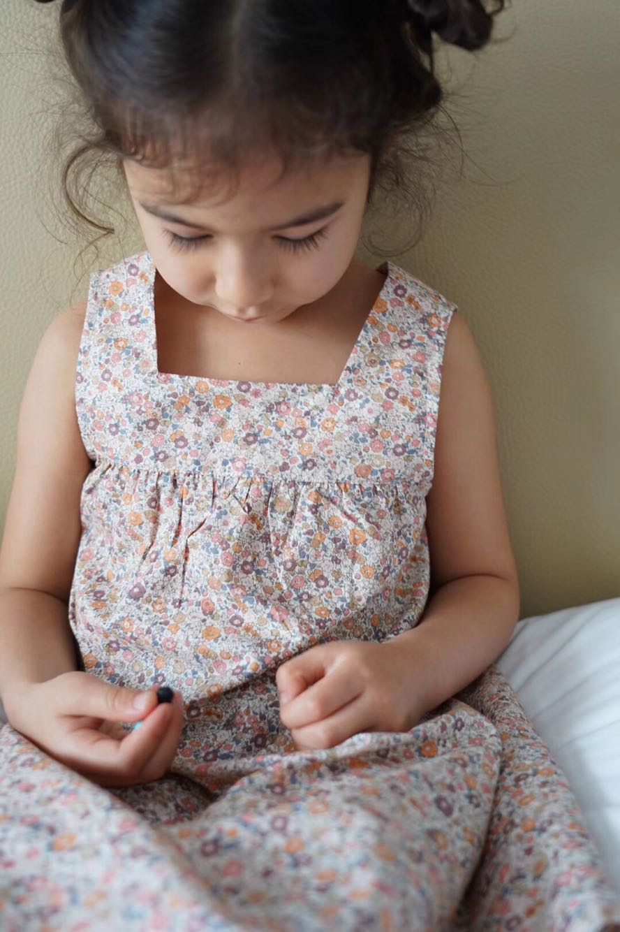 The dress Jacadi in the image features a light, floral print with various small flowers in soft pastel shades such as pink and orange. The dress has a sleeveless design with a simple, loose cut. The fabric is a lightweight cotton that flows gently. There are small gathers at the top of the dress, adding texture to the garment. It's a sweet, playful dress that is suitable for a casual summer day. The overall look is cute and simple